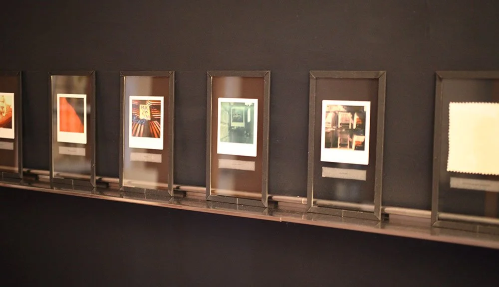 2011-2013; Ten 5.5 x 10 inch glass slides containing seven original SX-70 Polaroids, one fragment of a mattress cover, and text printed on silk organza displayed on stainless steel shelving. Installation. Dimensions variable.